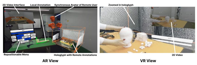 Multi-space annotations - Each user can create mid-air annotations. These annotations are color-coded to identify which user made them, and can be outlined/filled to show whether they’re made in the local space/hologlyph.