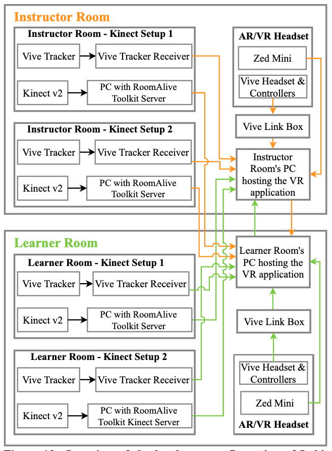 Each user has an identical setup using an HTC Vive, ZED Mini, and Kinect depth cameras. Here’s a full breakdown of the system setup and devices used: